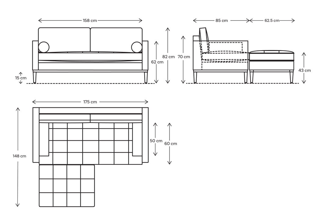 - Tiefe mit Hocker: 148cm